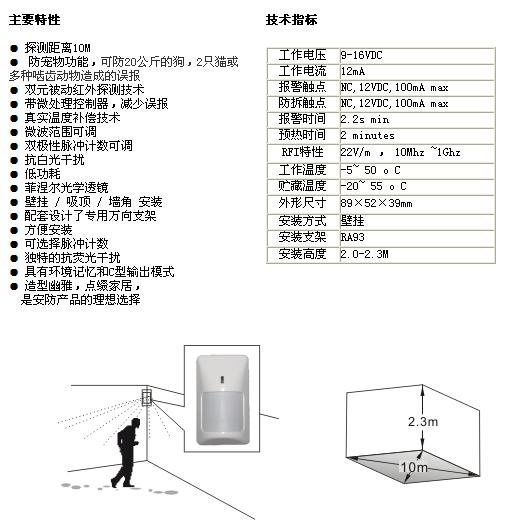 HC-9210PT雙元紅外被動(dòng)移動(dòng)探測(cè)器。防寵物型HC-9210PT探測(cè)器是專門設(shè)計(jì)用于家庭使用的,防范范圍10M。具有信號(hào)捕捉能力強(qiáng),誤報(bào)、漏報(bào)率低,低功耗和真實(shí)溫度補(bǔ)償?shù)奶攸c(diǎn)。配專利菲涅爾光學(xué)透鏡,抗白光干擾。產(chǎn)品技術(shù)含量 高、制作工藝考究、外觀造型高雅。